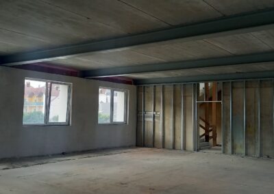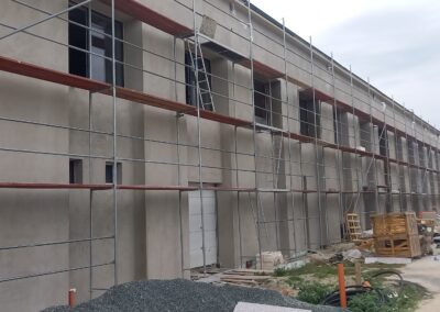Az emelet külső falai Wienerberger Profi 25cm-es síkra csiszolt téglából épültek. A tetőtér részben tégla, részben könnyűszerkezetes falakkal készül. Az épület 92 méter hosszú, a külső falak merevítésére belső betonfalak épültek, amik a külső pillérrendszerhez kapcsolódnak. Ezeken kívül a belső falak gipszkarton rendszerűek lesznek. Külső falakat 20 cm-es Baumit hőszigetelő rendszerrel szigeteljük. Külső nyílászárók 3 rétegű üvegezéssel Veka Premium 82MD profillal készülnek. Tégla és betonfelületek cementes anyaggal vakolva. A szerkezetkész ár az eddig leírtakat tartalmazza.